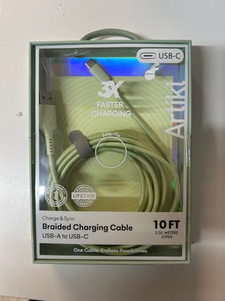 Cable de carga y sincronización trenzado de 3.05 metros de largo. - Conector USB-A a USB-C. - Diseño trenzado para mayor durabilidad. - Incluye sistema Easy-Tie para organizar el cable. - Carga 3 veces más rápida.
