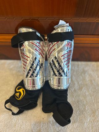 Espinilleras de fútbol Adidas en talla M. Diseño plateado con detalles en rojo y negro. - Cierre con velcro. - Incluye tobilleras negras. - Logo de Adidas visible.