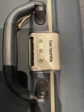 Maleta Samsonite de color azul y gris, con ruedas para facilitar su transporte. Sus dimensiones son 75x54x55 cm. - Asa extensible. - Candado integrado.