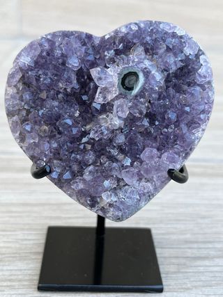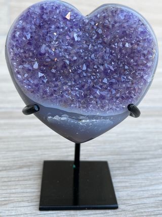 Preciosa drusa de amatista de Uruguay, con forma de corazón. Tiene una formación de flor de estalactita en el frente. Viene con peana a medida. Precio no negociable. 240 gramos (incluyendo la peana)