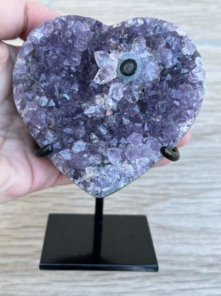 Corazón de amatista morada de Uruguay con una formacion de flor de estalactita, con peana a medida. Precio no negociable. 265 gramos