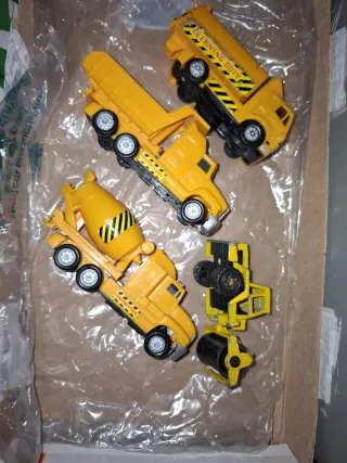Conjunto de cuatro camiones de juguete en miniatura de color amarillo de la Marca • New Ray 1995: - Camión volquete. - Camión hormigonera. - Camión de limpieza. • Majorette: - Aplanadora. #miniatura #vehículosdeconstrucion #majorette #newray