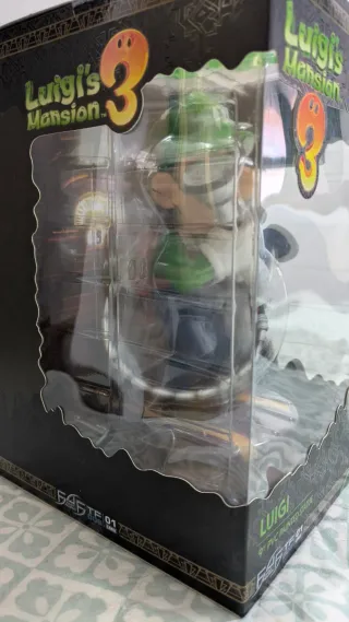 Figura de Luigi de Luigi's Mansion 3. - Figura de PVC pintada. - Mide 9 pulgadas de alto. - Detalle del personaje con su aspiradora de fantasmas.