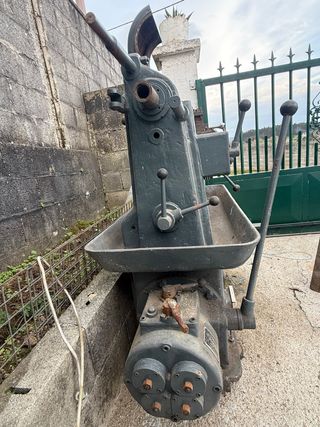 Se vende torno de metal. - Estructura robusta de color gris oscuro. - Múltiples palancas de control. - Bandeja recolectora. - Base con detalles circulares y tornillos.