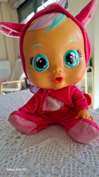 Muñeco bebé llorón con traje rosa brillante. - Diseño con capucha y orejas. - Detalles de estrellas en la cara. - Adorno de nube en el traje.