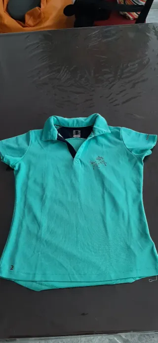 Camiseta de manga corta para equitación, ideal para el verano. Color verde agua con detalles en azul marino. - Talla 14 años. - Cuello tipo polo. - Dibujo bordado en el pecho.