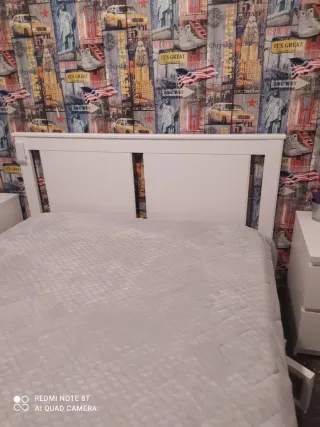 Cama de matrimonio de 150 cm de ancho. Ideal para una habitación. - Estructura de madera blanca. - Cabecero con diseño de lamas verticales.