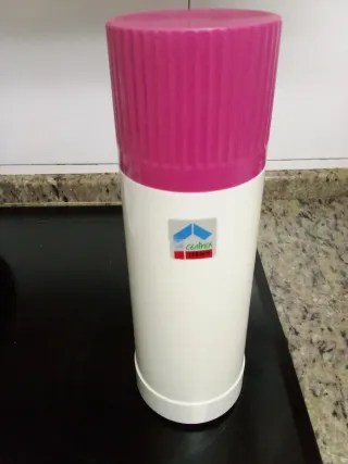 Termo de café de la marca CENTREX con un diseño moderno y funcional. - Color blanco con tapa rosa. - Fabricado en plástico resistente.