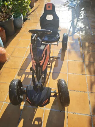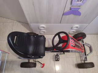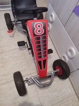 Divertido go-kart infantil Homcom para que los más pequeños disfruten al aire libre. - Diseño deportivo en color rojo. - Volante negro. - Ruedas negras. - Asiento negro. - Sin motor ni batería - Estructura resistente - Volate y freno de mano - Ideal para niños/as 5-12 años - Peso máximo 50 kg Sólo necesita hinchar las ruedas poner dos tornillos (arrglo sencillo y barato ) los tornillos no son necesarios ya con lo que tienes puestos te sirven perfectamente . El Kart está cuidado, limpio y listo para usar tras esos pequeños detalles . Entrega en mano Gavá .