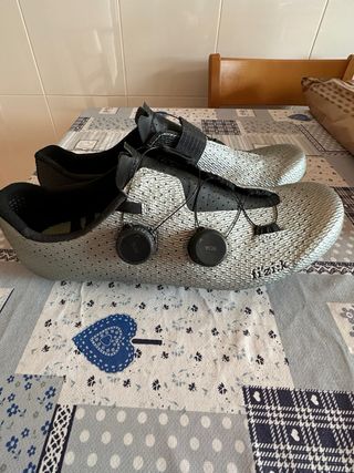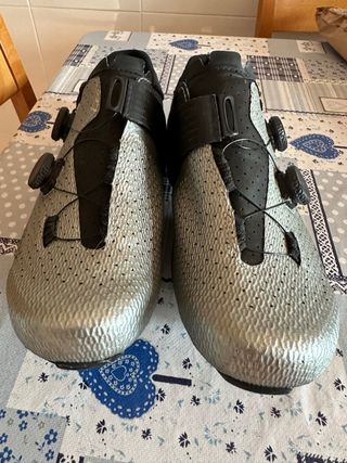Zapatillas de ciclismo Fizik Tempo en color plateado y negro. - Cierre BOA. - Diseño perforado. - Se venden sin calas En Perfecto estado, motivo de venta excesos de zapatillas