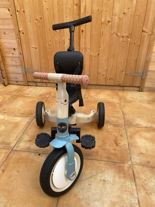 Triciclo multifunción Gyro de Olmitos en color azul, diseñado para niños de 1 a 5 años. Es un compañero ideal para el crecimiento y la diversión. - Asiento ergonómico con arnés de seguridad. - Empuñaduras cómodas para el niño. - Pedales antideslizantes. - Ruedas resistentes para diferentes superficies. - Barra de dirección para el adulto.