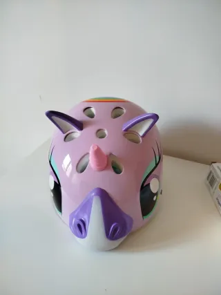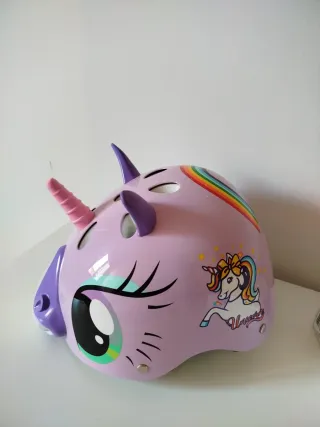 Casco infantil con diseño de unicornio en color morado. Ideal para proteger en actividades al aire libre. - Diseño de unicornio. - Color morado. - Orejas y cuerno decorativos. - Acolchado interior. - Múltiples orificios de ventilación. - Detalles de arcoíris en la parte superior.