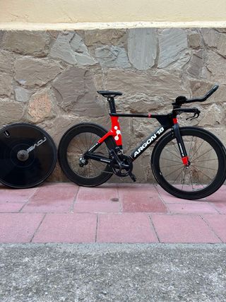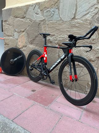 Bicicleta de contrareloj Argon 18 E-118 -Modelo: Argon 18 E-118 -Cuadro: Carbono -Talla: M -Grupo: Shimano Ultegra di2 desviador delajtero y trasero Grx di2 11v nuevo a estrenar -Bielas: Shimano Ultegra 172.5 -Platos: Specialities.T.A 56-44, también incluye 53-39. -Frenos: TRP -Manetas y Pulsadores: Shimano Dura-ace y ultegra maneta izquierda nueva a estrenar Di2 -Ruedas: Mavic Cosmic Carbono Perfil 60mm Delantera y Trasera de 80 mm -Lenticular: Roval con neumatico nuevo 80€ costo -Tubulares: Piel de caimán conntinental 25 mm -Pedales: Look Keo Classic 3 No acepto cambios ni ofertas absurdas Opcion de vender sin lenticular 2200€