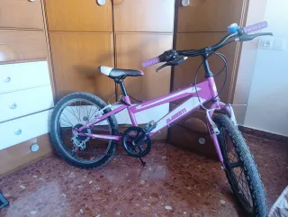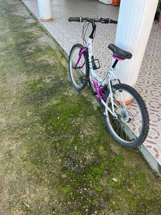 Bicicleta infantil con un diseño divertido y juvenil, ideal para las primeras aventuras sobre ruedas. Falta engrasar y limpiar , desperfectos del paso del tiempo unicamente - Cuadro de color blanco con detalles en rosa y morado. - Ruedas de 24 pulgadas. - Sillín ajustable en altura. - Frenos delanteros y traseros.