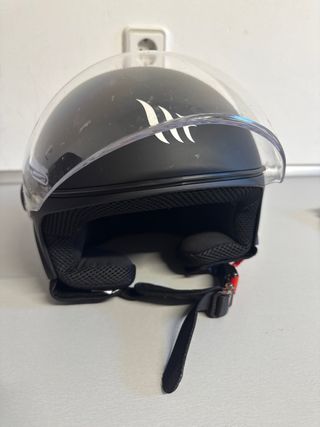 Casco jet en color negro mate - Visera transparente incluida. - Interior acolchado y cómodo. - Talla M 57/58 peso 1000 gr algo de oxido en la hebilla de cierre