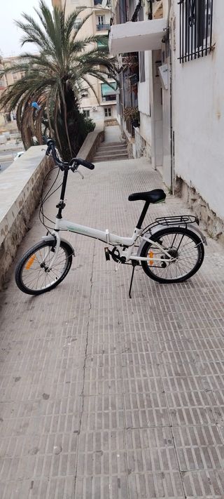 Ideal para desplazamientos urbanos y fácil de guardar. • Estado: Usada. La bicicleta ha estado guardada mucho tiempo y necesita una puesta a punto. Las ruedas giran bien y los frenos funcionan perfectamente, pero requiere pequeñas reparaciones y, sobre todo, aceite en la cadena para que el mecanismo vuelva a ser suave y fluido. • Ruedas: Neumáticos B'Twin Trekking en buen estado. • Accesorios: Incluye portaequipajes trasero y guardabarros. • Plegado: Sistema rápido y sencillo para cuadro y manillar. • Transmisión: Cambio de marchas trasero incluido. Perfecta para quien busque una bici económica y esté dispuesto a darle un poco de ma