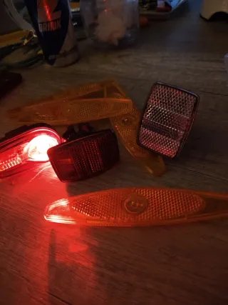 Conjunto de accesorios para bicicleta. - Luz delantera roja. - Reflector trasero rojo. - Reflectores naranjas para radios. - Reflector rectangular plateado.