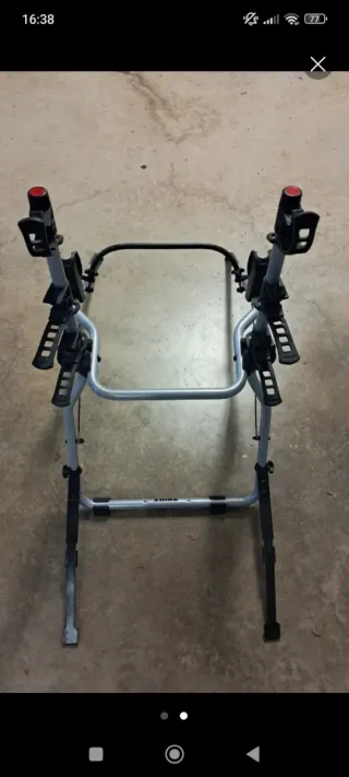 Portabicicletas para coche, ideal para transportar bicicletas de forma segura. - Estructura de metal negro. - Incluye correas de sujeción. - Con capacidad para transportar hasta 3 bicicletas según información técnica. Usado dos veces. He llevado un máximo de 2 bicis y van perfectamente.