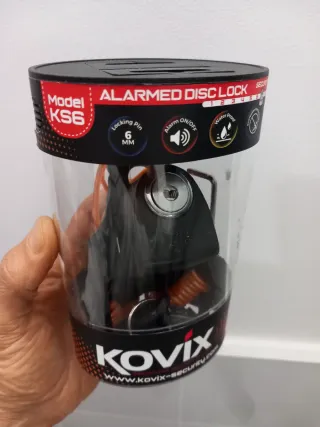 Candado de freno de disco de primera marca; Kovix KS6 con alarma integrada. El paquete está precintado. Lo abrimos juntos si quieres. - Modelo: KS6 - Pin de bloqueo: 6 mm - Alarma ON/OFF - Resistente al agua. Mejora la seguridad de tu moto. O para regalar.