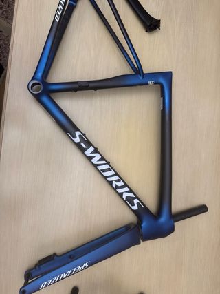 Cuadro de bicicleta S-Works SL8 con un acabado degradado azul y negro. Talla 52, manillar 40 potencia 100 - Diseño aerodinámico. - Marca S-Works en el cuadro. - Incluye horquilla y tija. El precio responde a tu pregunta . Listo para envio , inmediato , se puede ver . Nueva a estrenar