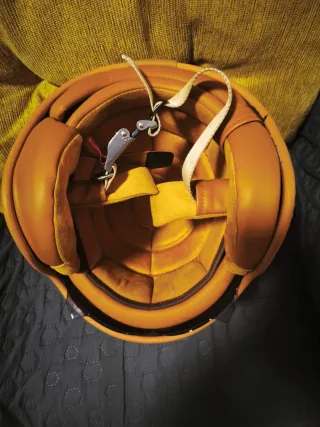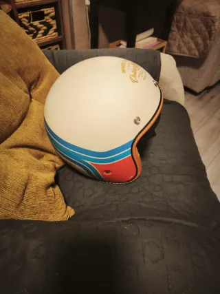 Casco de estilo retro, con un diseño vintage. - Color blanco con detalles en azul, rojo y marrón. - Acabado brillante. -visera plegable negra para el sol e interior el piel Poco uso y sin marcas,se entrega desinfectado y lavado