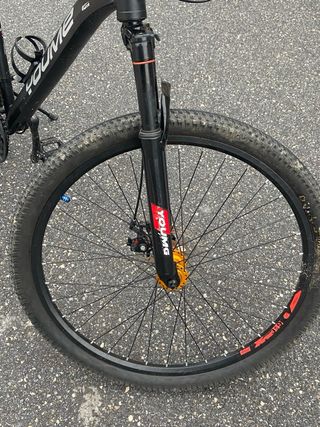 Bicicleta de montaña de color rojo, ideal para iniciarse en el ciclismo. - Cuadro de aluminio. - Ruedas de 29 pulgadas. - Frenos de disco hidráulicos. - Suspensión delantera. - Cubierta y cámaras nuevas