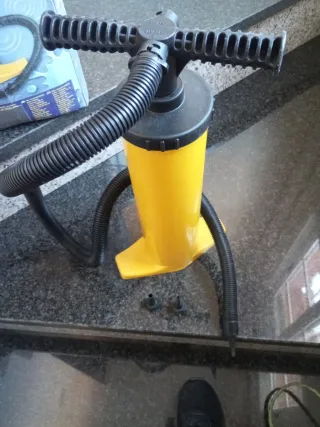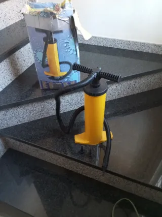 Inflador de aire de color amarillo, ideal para inflar colchones o juguetes. - Incluye manguera flexible. - Viene con dos adaptadores de boquilla.