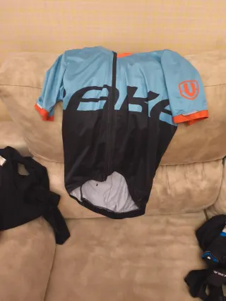 Conjunto de maillot y culotte de la marca Mondraker. - Maillot de manga corta. - Culotte. - Diseño en azul y negro con detalles naranjas. Talla m