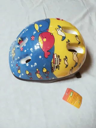 Casco infantil con un divertido diseño. - Diseño dividido en dos colores: azul y amarillo. - Ilustraciones de animales marinos, globos y barcos.
