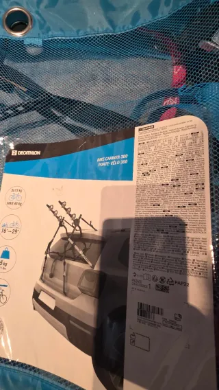 Vendo este portabicicletas de la marca Decathlon. Es el modelo 300. Vale para casi cualquier coche. Puedes poner bicis desde 16 y hasta 29 pulgadas. El peso maximo que acepta son 45 kilos.
