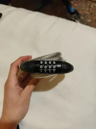 Cadena de seguridad con cable de acero y cerradura de combinación. - Cable de acero trenzado. - Combinación de 4 dígitos. Funciona perfectamente. Con algunas marcas de uso en los plasticos de la cerradura.