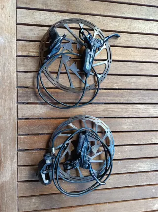Set de frenos SRAM Code de 4 pistones, Con un par de meses de uso - Incluye discos de freno. Delantero de 220mm y trasero 203mm center lock - Frenos hidráulicos de alta potencia.
