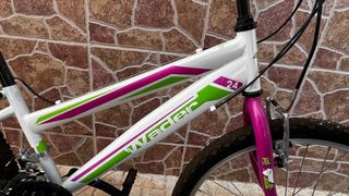 Bicicleta infantil de la marca Wader, con ruedas de 24 pulgadas. - Cuadro blanco con detalles en rosa y verde. - Sillín blanco con detalles verdes. - Frenos delanteros y traseros. - Caballete Nota: posiblemente las ruedas se deban hinchar por el desuso.