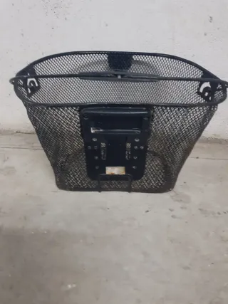 Canasta o cesta de malla metálica negra para bicicleta. - Diseño abierto y espacioso. - Asa de transporte integrada.