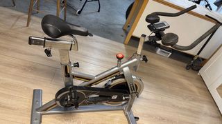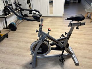 Bicicleta estática de alta gama, ideal para entrenamientos en casa. - Diseño robusto y estable. - Manillar ajustable. - Sillín cómodo y regulable. - Ruedas para fácil transporte.