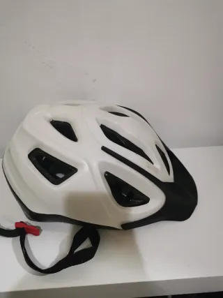 Casco de bicicleta en color blanco y negro, con correas ajustables y cierre de seguridad. - Diseño ventilado. - Visera integrada. - Hebilla de liberación rápida.