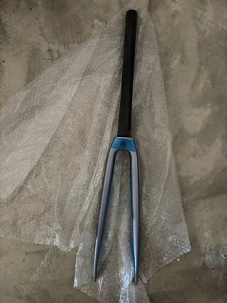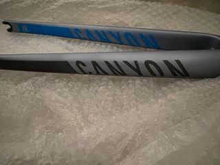 Horquilla de carbono proveniente de una Canyon CF SL 9.0. Diseño elegante en gris y azul. - Material: Carbono. - Color: Gris con detalles en azul. - Absolutamente nueva. Se quitó de la bicicleta y se guardó hasta hoy.
