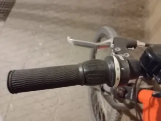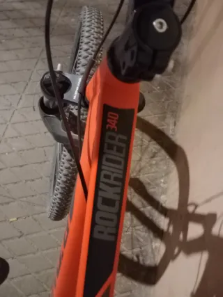 Bicicleta Rockrider 340 de color naranja. - Cuadro de aluminio. - Ruedas de 26pulgadas. - cambio de 3 platos y 7 pilones traseros - Suspensión delantera. Muy poco uso , se le ha quedado pequeña. No tiene ni un roce, la rueda trasera se infló con aire de "anti pinchazos"