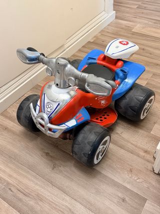 Quad eléctrico de Ryder de la Patrulla Canina, diseñado para niños de 2 a 4 años. Ideal para las primeras aventuras. Unico y genuino ya que ha sido pintado y personalizado en la forma y color del quad que lleva Ryder. Funciona con batería y se entrega con cargador. - Diseño inspirado en el que lleva Ryder. - Colores rojo, azul y blanco. - Ruedas todoterreno. - No pesa y es fácil de transportar en el carro de tu niño cuando se agota bateria, o se cansa de ir en él. Posibilidad de añadir al pack el chaleco del disfraz de Ryder usado una sola vez por 8 euros más. La cara ee tu hijo cusnfo lo vea, “no tendrá precio”