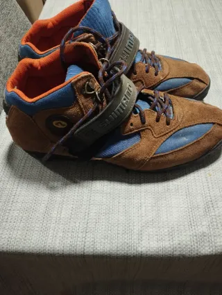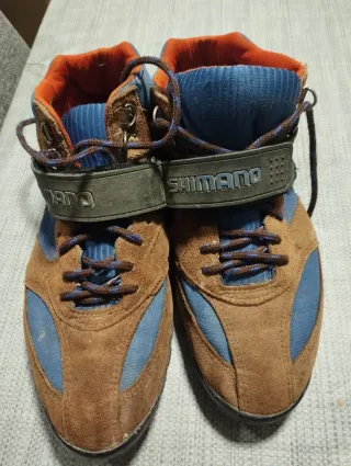 Zapatillas de ciclismo Shimano con un diseño deportivo y funcional. - Combinación de colores marrón y azul. - Cierre con velcro y cordones. - Detalle de logo en el lateral.
