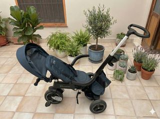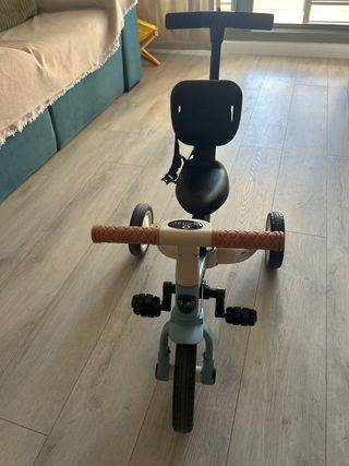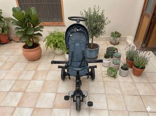 La solución perfecta para sustituir la silla de paseo, ya que se adapta al crecimiento de tu peque desde los 9 meses hasta los 5 años aprox. Características principales: •Modo Evolutivo: Se puede usar con el mango para que los padres dirijan el rumbo, y más adelante se convierte en un triciclo independiente. •Máxima Seg.: Incluye arnés, barra de protección frontal acolchada y capota extensible para proteger del sol. •Comodidad: Reposapiés plegable para cuando son más pequeños y pedales con función de "rueda libre" •Extras: Timbre en el manillar y mango parental regulable en altura Estado: Muy bien cuidado, limpio y listo para usar