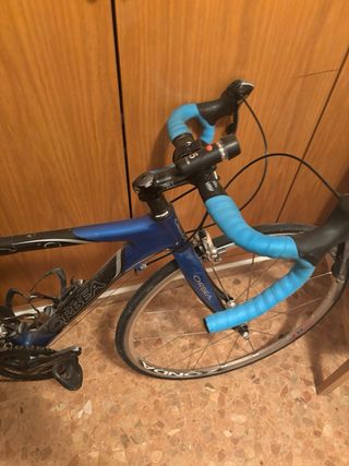 Bicicleta de carretera Orbea de color azul. -De titanio - Cuadro de carbono. - Manillar con cinta azul. - Portabidones negros. Recogida en mano