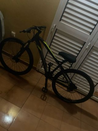 Bicicleta de montaña en color negro con detalles amarillos. - Cuadro de aluminio. - Horquilla delantera. - Manillar negro. - Rueda delantera con banda de rodadura marcada.