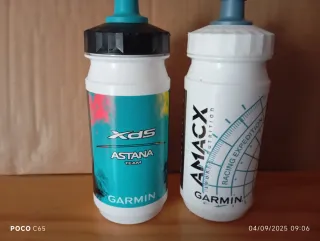 Preferencia por cambiar. Dos bidones de ciclismo de la marca Garmin, uno con diseño de Astana y otro con diseño de XDS. - Bidón Garmin Astana. - Bidón Garmin XDS.