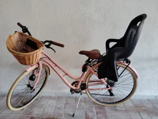 Bicicleta rosa con cesta y silla para niño
