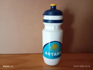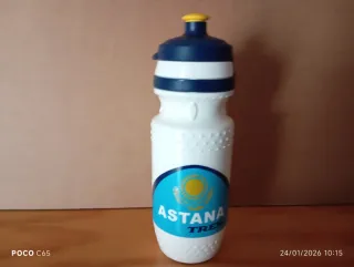 Bidón de ciclismo con diseño del equipo Astana. Preferencia por cambiar - Color blanco con detalles en azul y amarillo. - Tapa azul con boquilla amarilla.