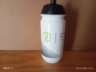 Bidón de ciclismo del equipo Cofidis, edición 2025. Es de color blanco con detalles en rojo y amarillo. - Está en buen estado. - Perfecto para hidratarse durante tus salidas en bici. - Incluye un bidón. Preferencia por cambiar