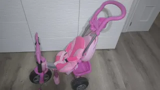 Tiene pedales y reposapiés para niños pequeños. Dispone de barra con empuñadura para empujar en la etapa inicial cuando todavía no da pedales. Tiene reposa vasos para el adulto y sombrilla para el niño. Además tiene un volquete detrás para colocar cosas y una mochila de plástico duro que se acopla en las barras de atrás. Los reposapiés se puede doblar hacia arriba para cuando pueden dar pedales. Tiene una estructura que rodea al niño para que no se caiga, con un juego con música en la bandeja delantera y reposa vasos para el niño. Se pueden desmontar las barras. Muy poco uso.