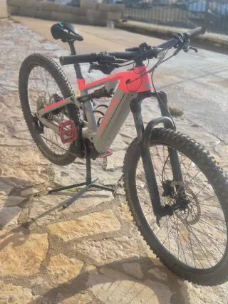 Bicicleta eléctrica Canyon con cuadro de color gris y detalles en coral. Modelo Neuron on talla xs, ideal hasta 160, niños , chicas , - Cuadro de aluminio. Cambio XT - Suspensión delantera y trasera. - Frenos de disco. - Ruedas Schwalbe.