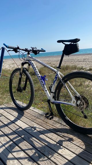 Bicicleta de montaña con ruedas de 29 pulgadas. Specialized Crave compt - Talla L. - Cuadro blanco con detalles azules. - Incluye portabidón azul.